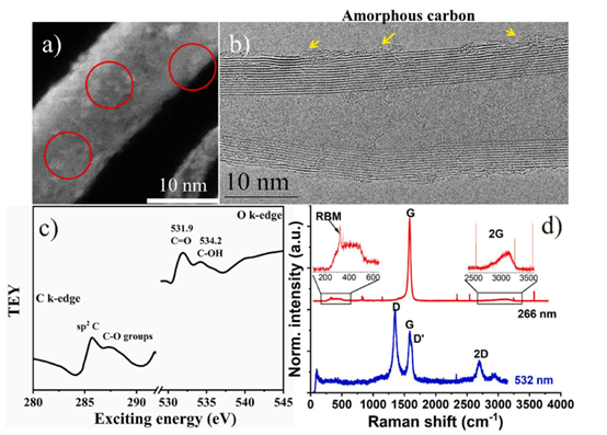 圖1. a) 商業(yè)碳納米管(CNT)的掃描透射電子顯微鏡(STEM)圖像。 b) 樣品的高分辨電子顯微鏡(HREM)圖像。 c) 來自近邊X射線吸收精細(xì)結(jié)構(gòu)(NEXAFS)測量的碳納米管(CNT)的碳和氧K邊吸收譜。 d) 使用兩種不同激光(266 nm 和 532 nm)測得的樣品拉曼光譜。
