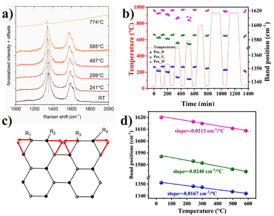 觀察: D峰、G峰、D'峰等拉曼峰的峰位隨溫度變化表現(xiàn)出近似線性的關(guān)系(即峰位移動量Δω ≈ β × ΔT,β是溫度系數(shù))。