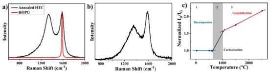a) 典型石墨結(jié)構(gòu)(高度有序熱解石墨,HOPG)和典型生物質(zhì)衍生無定形碳(經(jīng)退火處理的水熱碳,annealed HTC)的拉曼光譜。
