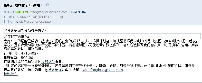 我公司第九次楊帆技術(shù)捐款已經(jīng)匯出