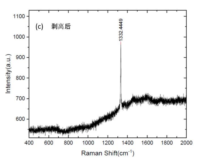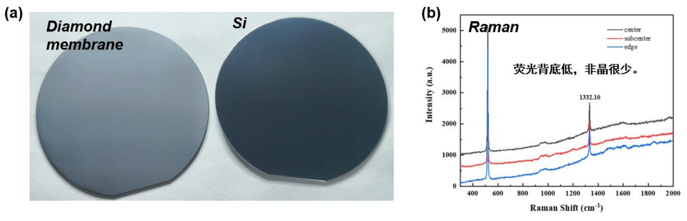 (a)生長(zhǎng)前后對(duì)比圖。生長(zhǎng)后在 Si 基底形成致密金剛石薄膜(b)拉曼光譜顯示,整個(gè)金剛石薄膜晶體質(zhì)量和均一性良好。